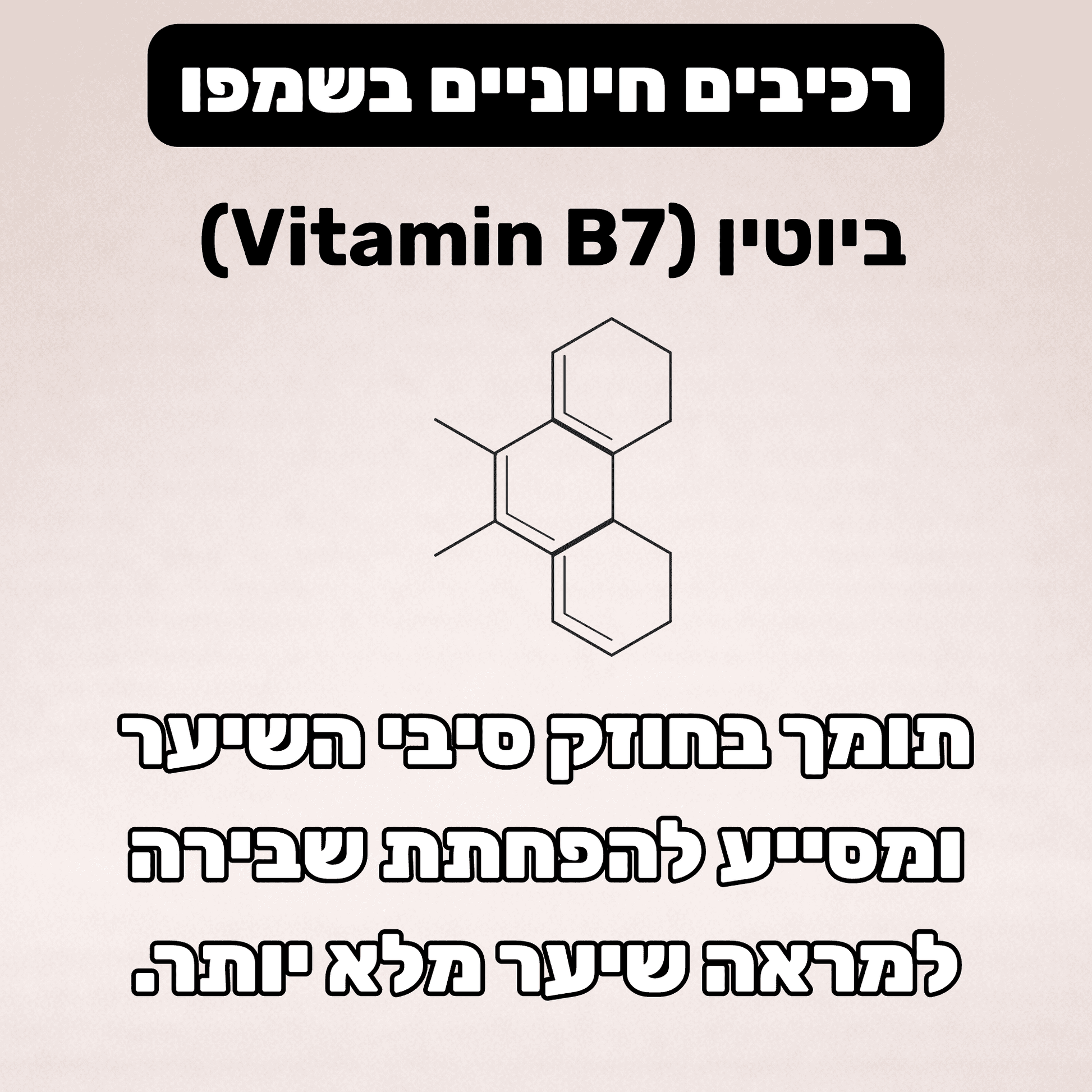 ביוטין (ויטמין B7): תומך בחוזק סיב השערה ומסייע להפחתת שבירה, כך שהשיער נראה מלא ובריא יותר.