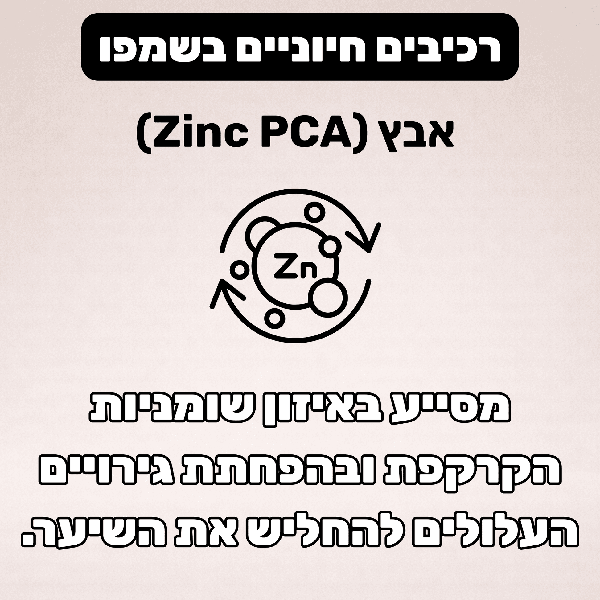 Zinc PCA (אבץ): מסייע באיזון שומניות בקרקפת, תומך בהפחתת גירוי ומסייע בשמירה על סביבה נקייה ובריאה לזקיקים.