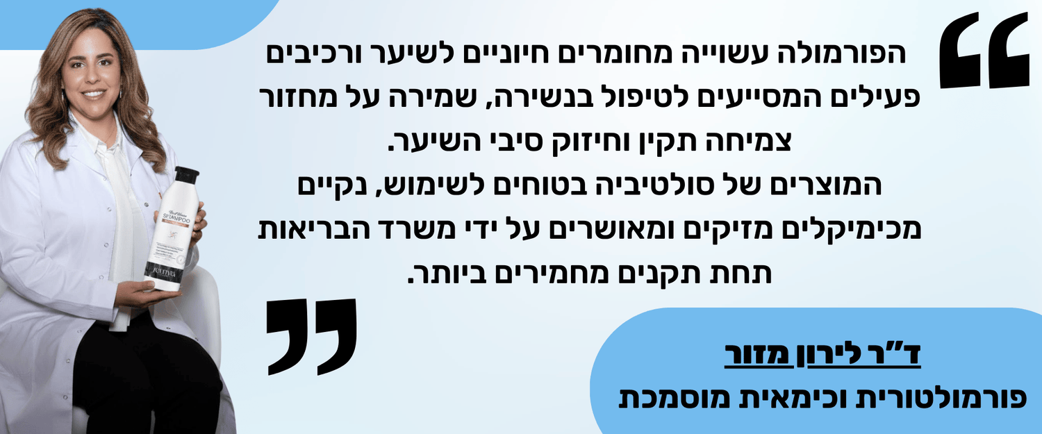 בפיתוח הפורמולה שלנו דאגנו לא לכלול כימיקלים שיכולים לפגוע בבריאות הקרקפת, המופיעים ברוב המוצרים הקיימים בשוק.